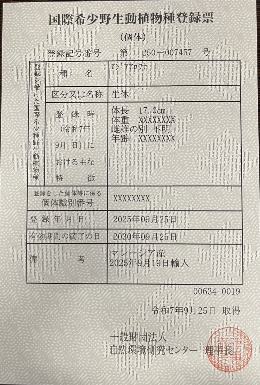 国際希少野生動植物登録票:250-007457