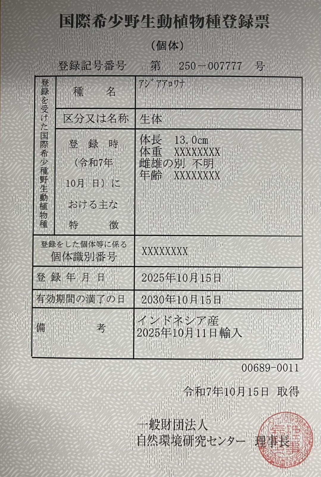 国際希少野生動植物登録票期限満了日 2030年10月15日