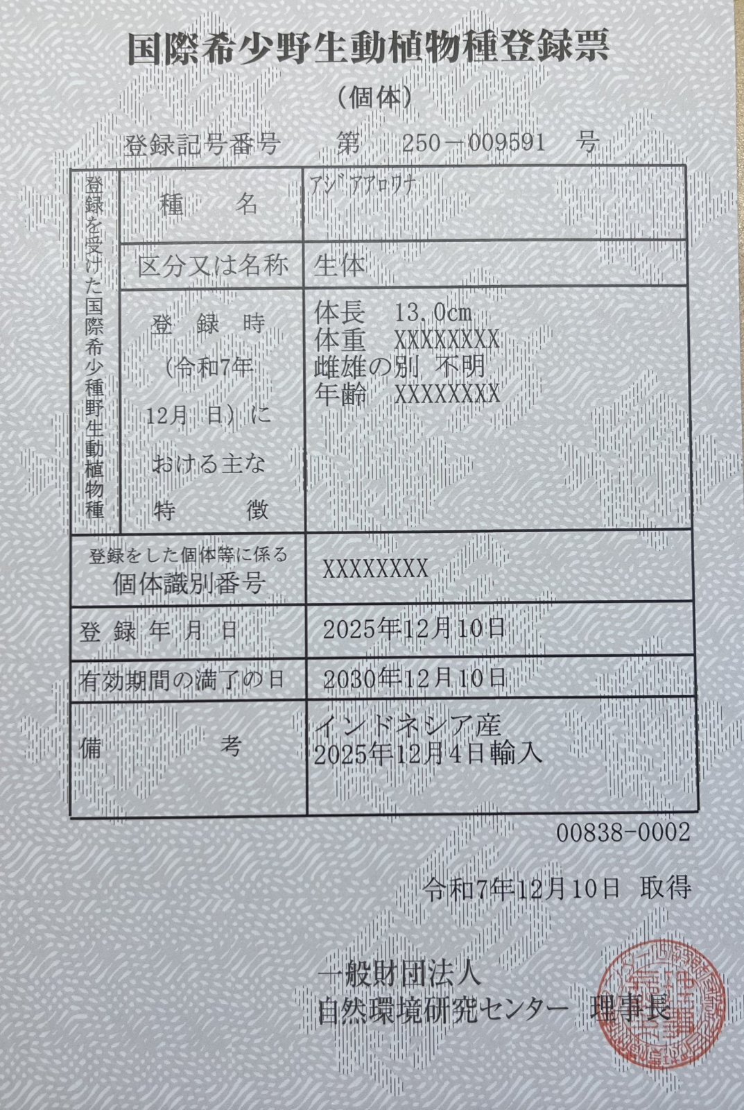 国際希少野生動植物登録票期限満了日 2030年12月10日
