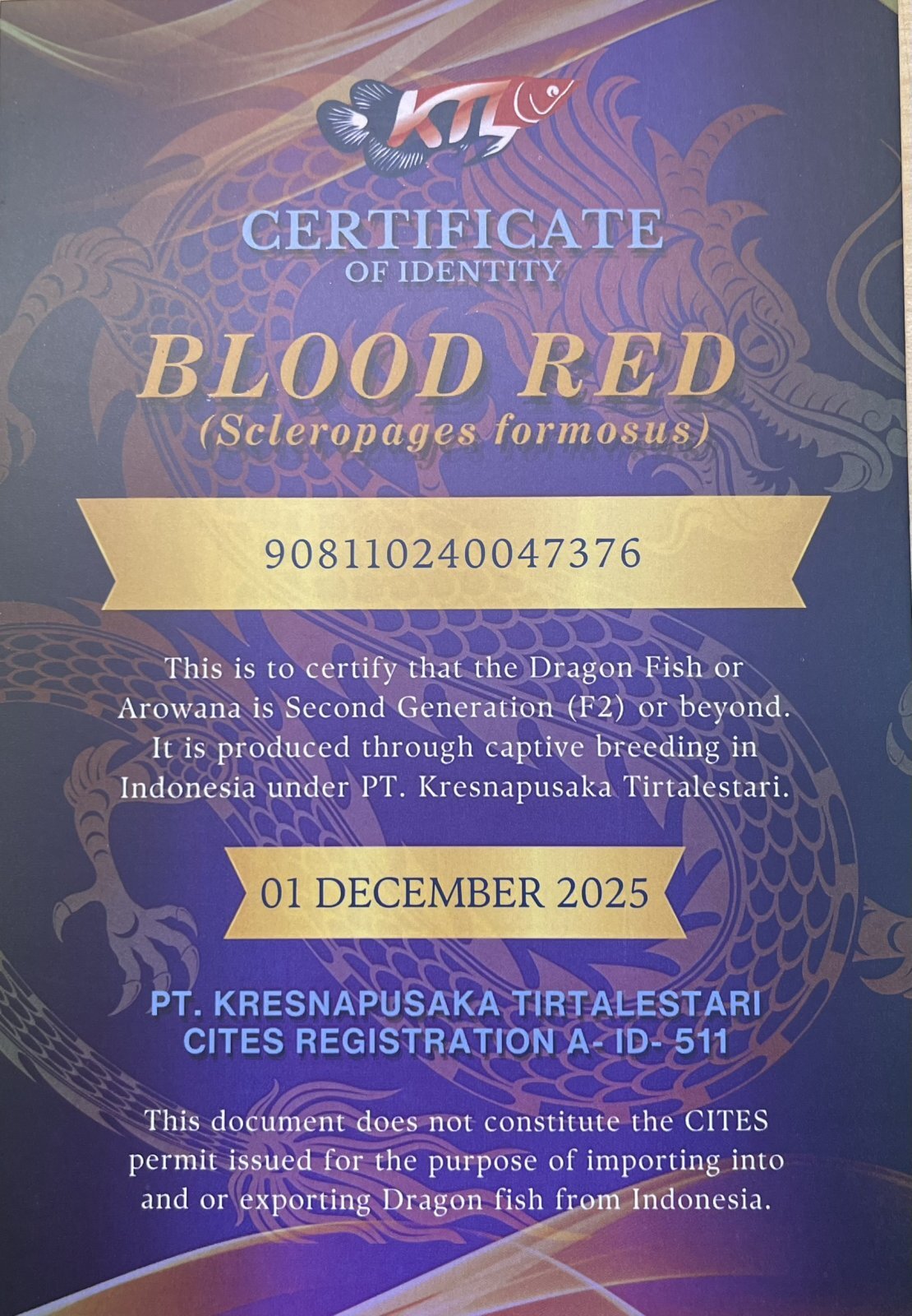 国際希少野生動植物登録票:250-009615