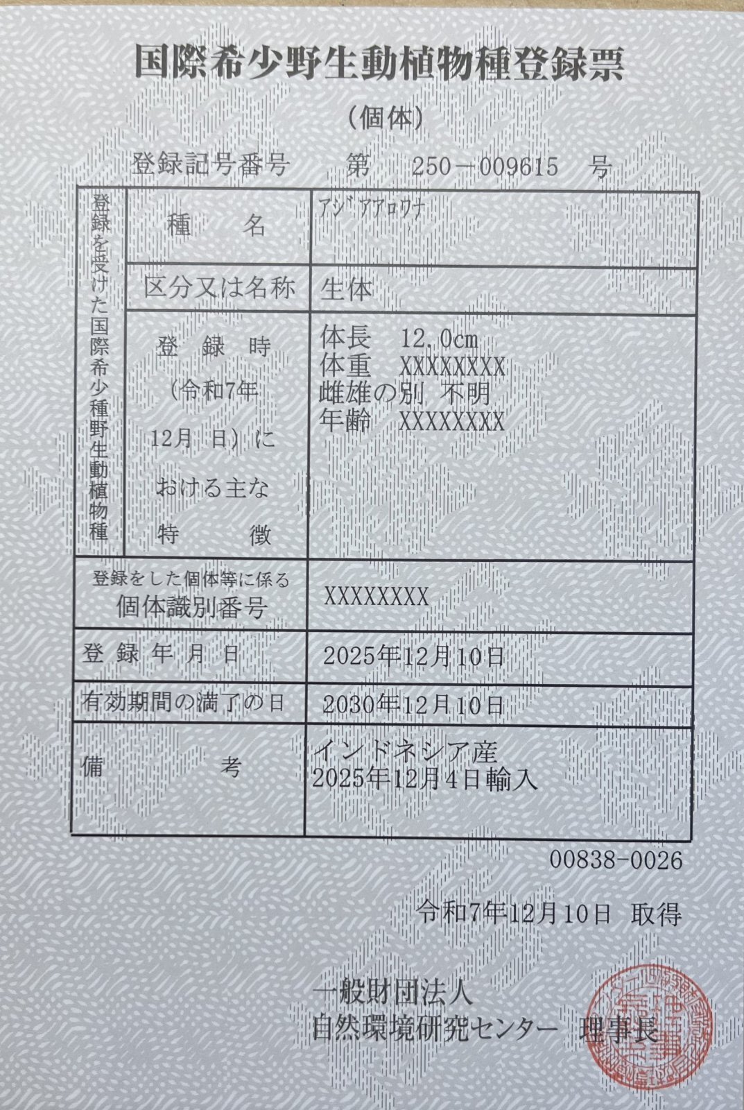 国際希少野生動植物登録票期限満了日 2030年12月10日