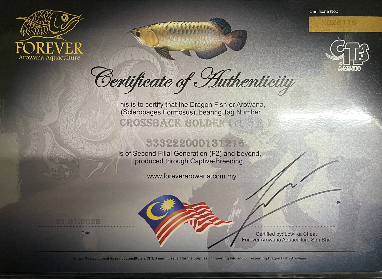 国際希少野生動植物登録票:260-000276
