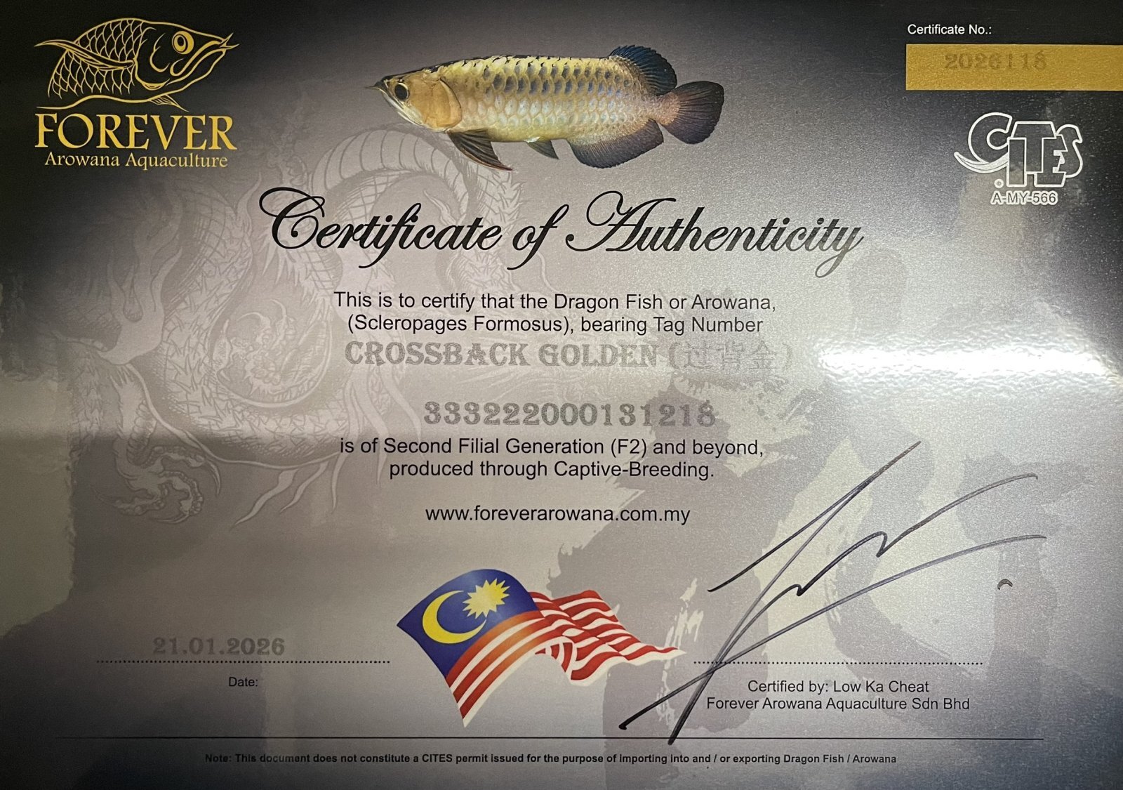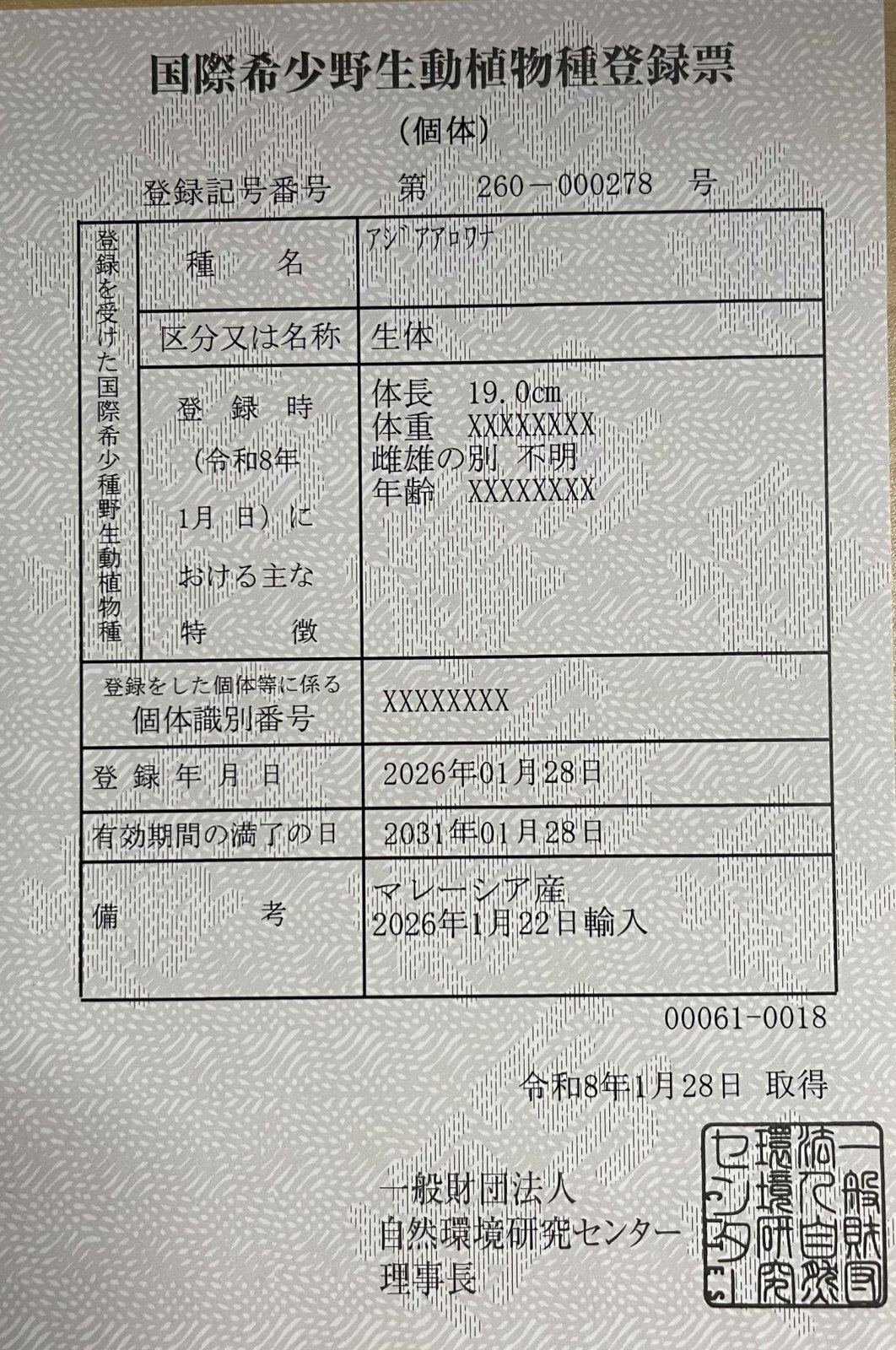 国際希少野生動植物登録票有効期間満了日:2031年1月28日