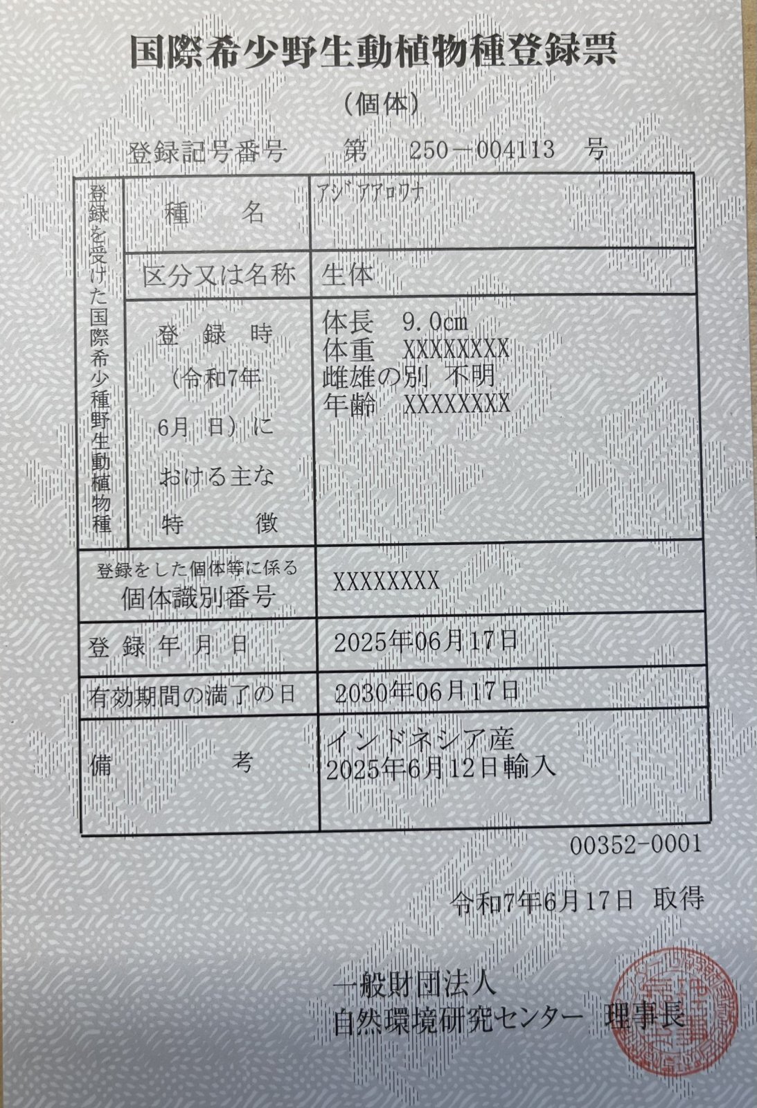 国際希少野生動植物登録票期限満了日 2030年6月17日