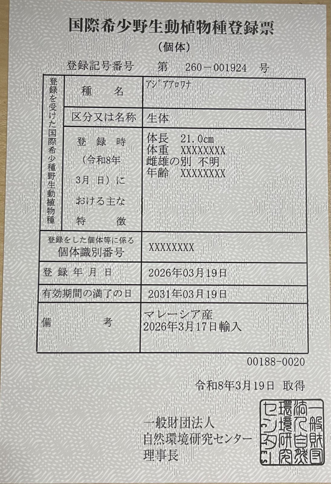 国際希少野生動植物登録票有効期間満了日:2031年3月19日