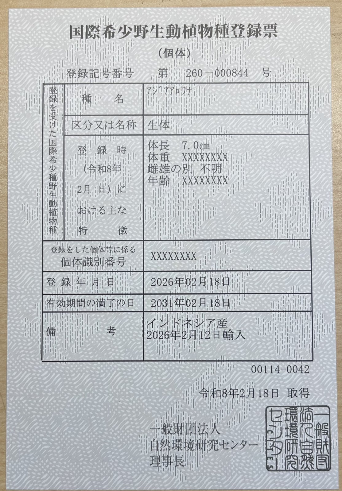 国際希少野生動植物登録票期限満了日 2031年2月18日